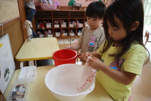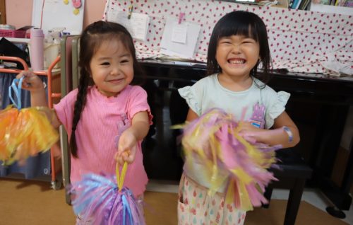年長さんがチアで使うポンポンを見て、「つくりた~い」