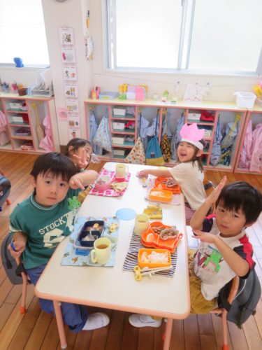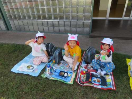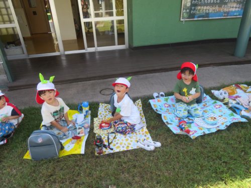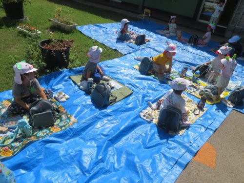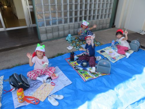 先日はピクニックお弁当を実施☀初めてだったので、ブルーシート上に上履きで進んで個人のレジャーシートを敷いてみましたが、上手に広げて準備できました!(途中、日向が暑くて日陰にお引越し…💦)いつも以上に食が進み、「お外で食べると楽しいね」「おいしいね」と♡もっといろんなところでも食べてみたいね!と、次回を楽しみにしているようでした♪