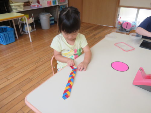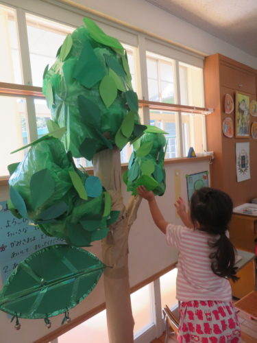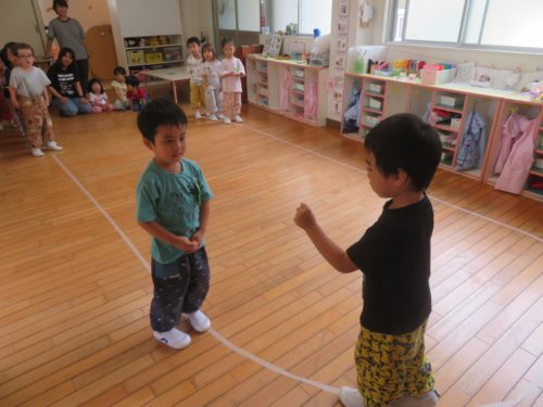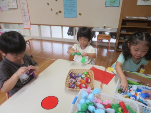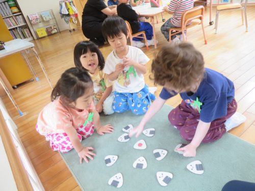 また、すずらん組にはいろいろなクラスのお友だちが「こんにちは~」とよく遊びに来て、一緒に遊んだり過ごすことも多く、自然に縦の関わりが生まれて楽しそうです♪お兄さんやお姉さんの姿を真似て工作してみたり、おにぎりゲームでいつもは勝負強い人も、お姉さんには敵わない~と尊敬のまなざしを向けていたり。