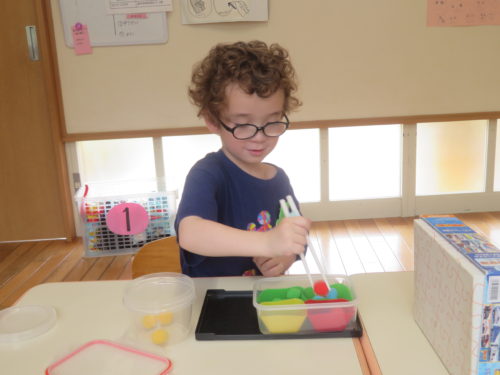 モンテッソーリでは、文字への興味が拡がって、ひらがなスタンプに取り組んだり、糸掛けや縫い刺し、花の水切りなどにも挑戦。“やってみよう!”の気持ちがいっぱいの子どもたちです✨