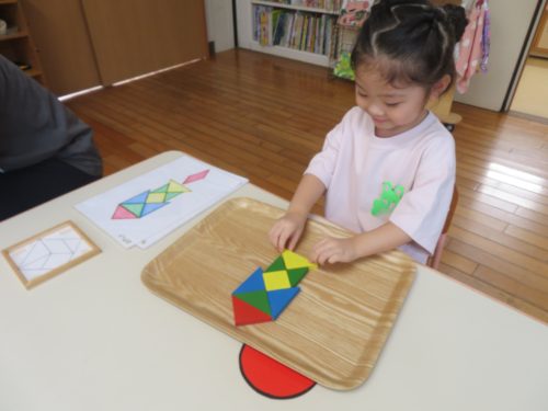 見本の上に同じ形を重ねて作る人が多い中、たくさん取り組んだRちゃん、自分で隣に同じ形を作り始めました!すごい!友だちも興味津々でした👀✨