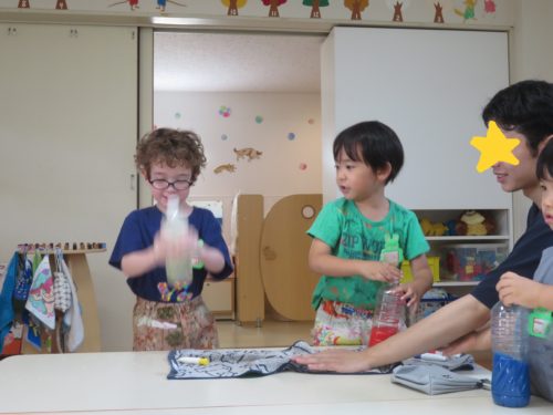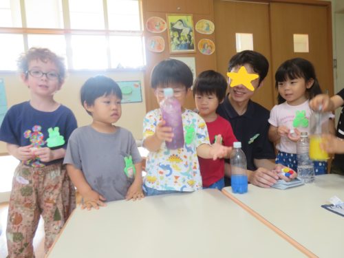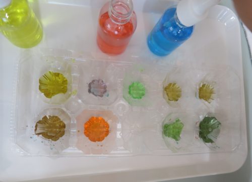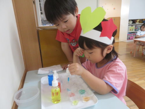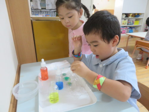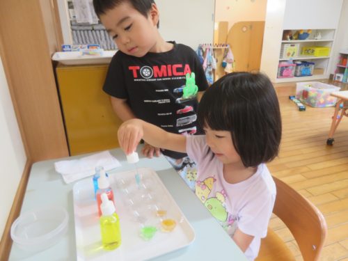 『ふしぎなキャンディーやさん』のキャンディーの“色”、年少さんで行った色水スプレー遊び(後日紹介します♡)などを通し、“色”に興味を持った子どもたち。お部屋でも色水(食紅)を混ぜる混色遊びや、実習生の先生と一緒に魔法のジュースやさんごっこなどを楽しみました♪