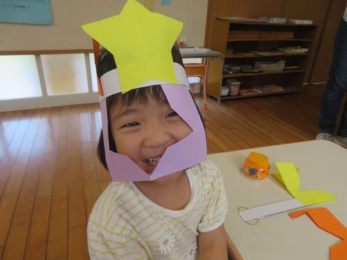 切り抜いた形はお面みたい!ひらめいたAちゃん、冠の下に付けて…☆