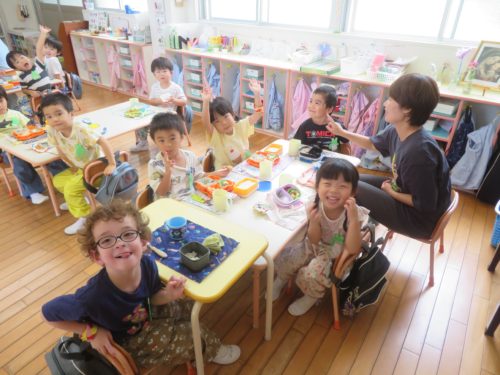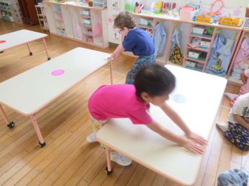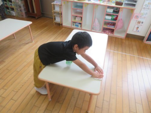 毎日のお手紙配達(朝、出欠席を職員室まで届けます✉)やお祈りなど、1学期は有志で取り組んできましたが、やる気満々で日々取り合いになるほど。そこで、順番に回ってくるようにお当番制にすることを提案すると「いいね!」の声が。今までの2つのお仕事に加え、最近は食前の机拭きも取り組みはじめました!みんな張り切っていて、「次はいつ?」「ぼくはまだ?」と終った傍から楽しみにしていたり、登園時お当番なことを思い出し、サクサク身支度を進めて、意気揚々と「行ってきま~す✉」✨