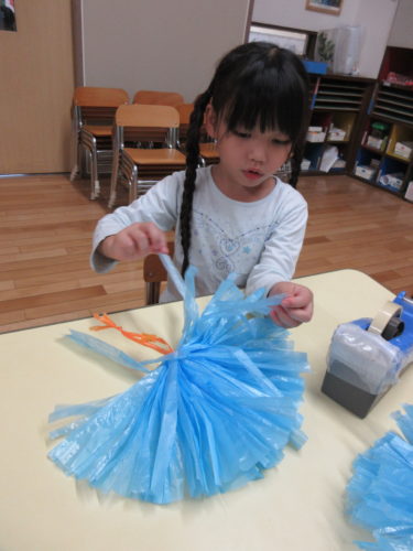 ということで、子どもたちと相談して応援グッズを作ることに。「ペットボトルに何か入れて音が鳴るやつがいいと思う」「チアの時に使うポンポンは?」「旗もあるよ!」「うちわとかはどう?」など子どもたちから意見をもらい、みんなでどれがいいか考えて「水色のポンポン」を作ることに決定!