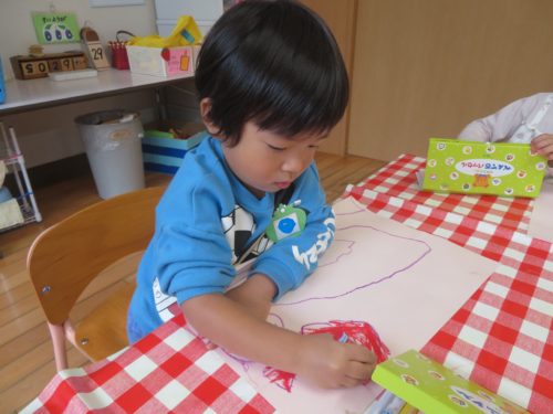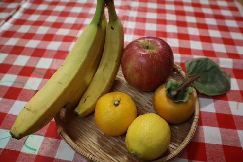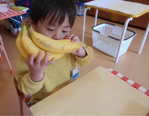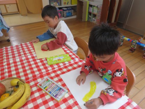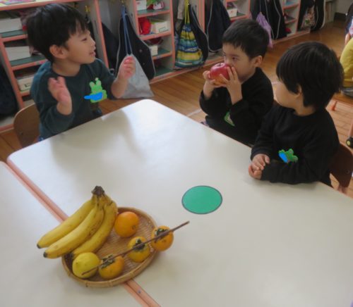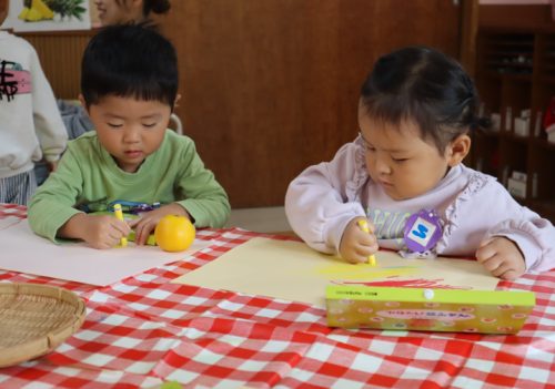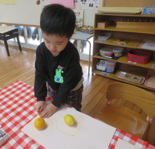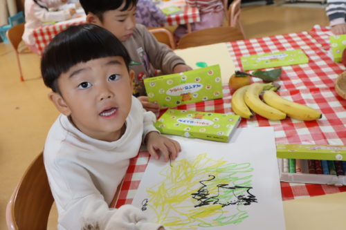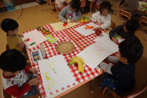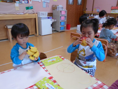 本物のくだものを見て、触って、嗅いで、、、絵にかきました。