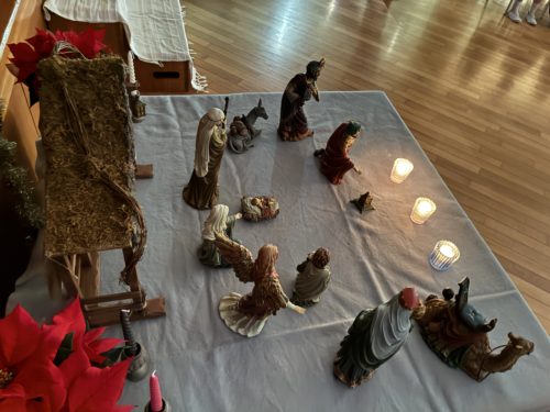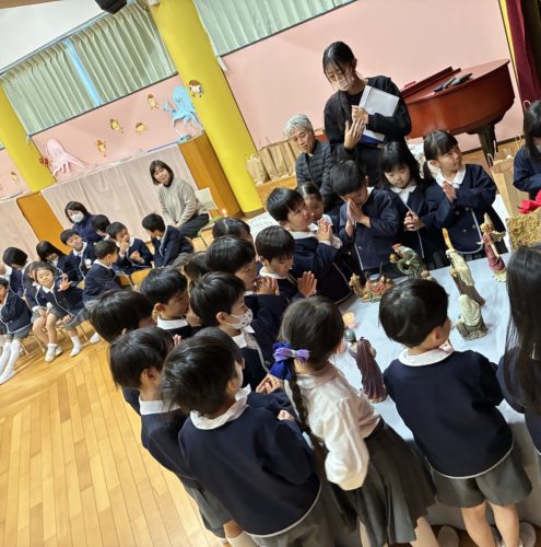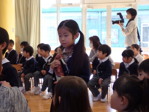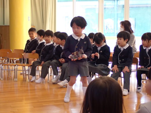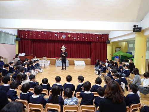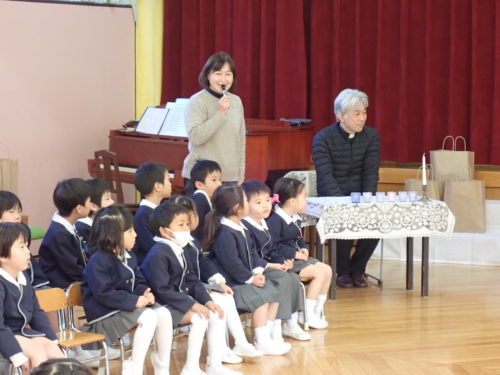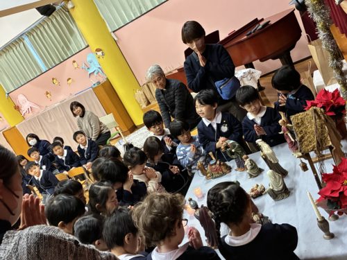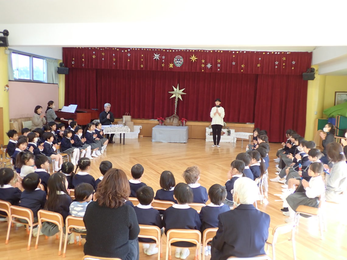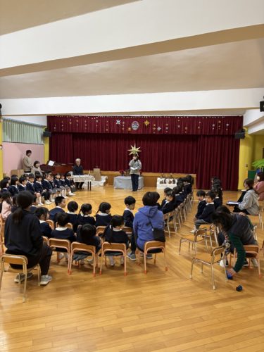 イエスさまがお生まれになるご降誕までの聖書のお話と共に、年長さんの代表者がご像を馬小屋に運び、イエスさまの誕生をお祝いする場面が作られていきました。