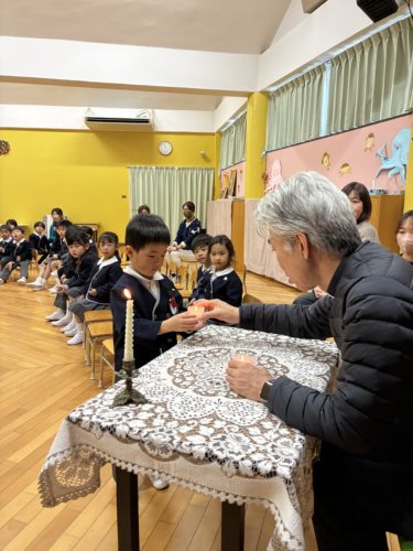 赤ちゃんとしてお生まれになったイエスさま。 ”赤ちゃんは何でかわいいのかな?” すぐ泣くし、自分では何もできないけれど、かわいい。無力だけれど、なんにでも一生懸命!すべてに全力! 泣くのも食べるのも、笑うのもうんちするのも一生懸命!一生懸命に力を出し、命を輝かせているから、かわいいんだよね。みんなもひとり一人神さまからいただいている灯を大切に、何でも一生懸命に力を注ぎ、命を輝かせていきましょう、とお話してくださいました。