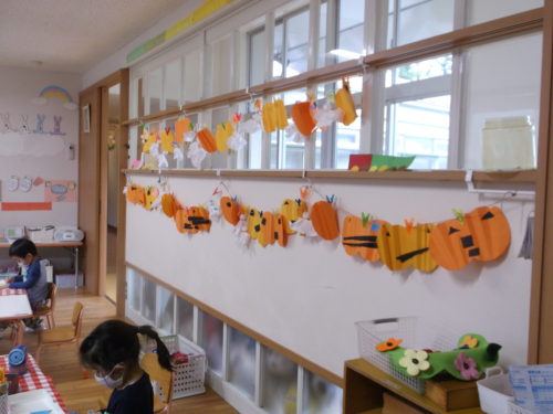 可愛いかぼちゃのオバケたちが並びました♡ちょっとした物音でも「オバケが来たのかも⁈」とビックリしていたカワイイ子どもたちです。
